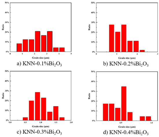 Figure 3 shows the particle size distribution of the KNN-xBi2O3 piezoelectric ceramics. When the doping concentration x is 0.1, the distribution of grain size is not uniform; the grain size ranges from 0.5 μm to 4.5 μm. With an increase in doping concentration, the grain size decreases and the uniformity of grain size increases. When the doping concentration x is 0.4, the grain size fluctuates around 1 μm and the average grain size reaches the minimum value of 0.49 μm. The SEM data show that Bi2O3 doping can effectively reduce the grain size of the ceramics and improve the uniformity of grains. However, when the doping concentration x is greater than or equal to 0.2, the pores will increase, so the doping concentration of Bi2O3 should be adjusted reasonably.
