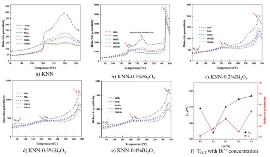 Figure 4 shows the dielectric temperature spectrum of KNN-xBi2O3 ceramics. The mesothermal spectrum of KNN ceramics is shown in Figure 4a. KNN ceramics have an orthorhombic phase structure at room temperature and undergo trigonal–tetragonal and tetragonal–cubic phase transitions at 209 °C and 304 °C, respectively. Figure 4b–e present the dielectric spectra of KNN-x%Bi2O3 ceramics, corresponding to samples with doping concentrations of 0.1%, 0.2%, 0.3%, and 0.4%. From Figure 4b, it can be observed that there are three distinct peaks in the dielectric temperature map. The peak at 281 °C corresponds to the depolarized dielectric peak. After this peak, the remaining two peaks correspond to the quadrature at 194 °C. The tetragonal phase transition at the dielectric peak and the tetragonal–cubic phase transition dielectric peak at 429 °C. There are also three peaks in Figure 4c–e, which correspond to the orthogonal–trigonal phase transition dielectric peak, the orthorhombic–tetragonal phase transition dielectric peak, and the tetragonal–cubic phase transition dielectric peak, respectively; the corresponding temperatures are 57 °C, 215 °C, and 433 °C, respectively. It can be seen Bi3+ doping can increase the orthogonal–trigonal phase transition temperature of KNN-based ceramics around 50 °C. Figure 4f presents the orthorhombic–tetragonal phase transition temperature and dielectric constant under different concentrations of bismuth oxide doping. Except for individual singular points, the overall trend of the two is an improvement with the increase of bismuth oxide doping concentration. Among them, the overall improvement in TO-T is relatively low, but the dielectric constant is significantly improved. When the doping concentration x was 0.4, the dielectric constant is increased by nearly 30% compared with KNN ceramics. This is because Bi3+ doping increases the proportion of the trigonal phase at room temperature, making the orthogonal–trigonal mixed phase structure at room temperature. Therefore, the dielectric properties of KNN ceramics can be improved by doping Bi3+.