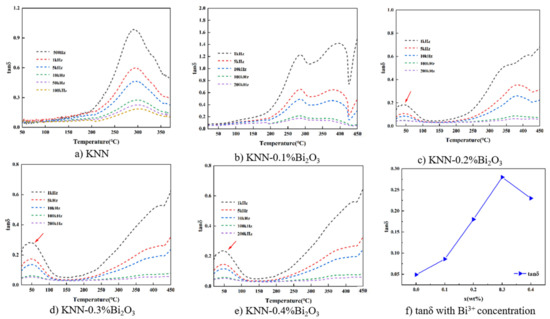 Temperature dependence of dielectric loss tanδ for KNN-x%Bi2O3(x = 0.0, 0.1, 0.2, 0.3, 0.4) ceramics.