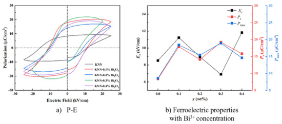 Figure 6a displays the hysteresis loops of KNN-x%Bi2O3 ceramics under the electric field of 25 kV/cm. With the addition of Bi3+, the squareness of the hysteresis loops of the samples increased with the increase in Bi3+ concentration, indicating that the ferroelectric properties of the ceramics also improved with the increase in Bi3+ concentration. The hysteresis loop of the sample with doping concentration x = 0.3 is poor. Combined with SEM data analysis, it was observed that there were many pores in the sample, which result in excessive internal leakage current. Figure 6b shows the relationship between remanent polarization, coercive field, and saturation polarization with doping concentration. Bi3+ doping can soften KNN ceramics, making it easier for domains to flip. The influence of polarization intensity is greater, and they all follow an increasing trend. When the doping concentration x is 0.1, the increase reaches 70%. However, with an increase in the Bi3+ doping concentration, the magnitude will decrease. In addition, the coordination number around the pores may also be increased due to grain size reduction. When the coordination number is greater than or equal to 6, the grain growth will slow down the shrinkage of the pores [29]. The remanent polarization and the maximum polarization of the ceramic decrease.