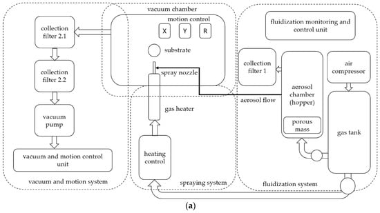 Aerosol Deposition (AD)—a deposition method based on room-temperature shock-loading particle consolidation [18,19], which has also been used for HA particles deposition [20]. This technique enables the deposition of powder with particle sizes in the range of 0.02–2 μm on various substrates. AD is designated for spraying particles to obtain metal, ceramic, and other coatings with a thickness ranging from several to hundreds of microns [19]. The AD apparatus developed by Akedo [18] consists of a spraying nozzle, vacuum deposition, and particle-gas aerosol chambers. A converging or diverging–converging type nozzle accelerates the particles of a powder-laden gas jet, which forms the coating on the substrate in the deposition chamber. This chamber is evacuated during the deposition process using a rotary vacuum pump and a mechanical booster pump. The aerosol chamber or fluidized bed powder hopper generates particle-gas aerosol using the fluidized bed effect. This effect is achieved due to gas passing through the powder at high enough speeds to suspend the powder particles and cause them to behave as though they were a fluid. A chamber vibration system to mix the powder with the carrier gas is applied to enhance the mixing process. In the Akedo [18] AD design, the powder-gas aerosol is fed into the spraying system axially. Drawbacks of the AD apparatus are the following: (1) gas pressure in the fluidized bed aerosol chamber depends on spraying pressure to achieve a particle axial injection into the nozzle and sufficient powder feed rate of the process; (2) a nozzle clogging with the particles to be deposited is possible because of the small diameter of the nozzle orifice; (3) gas heating to increase the particle velocity may increase the clogging of the nozzle.