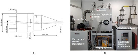 The drawbacks of Aerosol Deposition might be overcome through the use of radial injection into the divergent part of the nozzle similar to that being used in the LPCS, as described in [24,25]. In this case, gas heating to temperatures of 500–600 °C is possible, and fluidized bed aerosol chamber parameters (gas pressure, vibration amplitude, and frequency) are controlled in the wide ranges. In the modified Aerosol Cold Spray (ACS) system (Łukasiewicz Research Network—Poznań Institute of Technology, Poznan, Poland), the fine powder contained in the particle-gas aerosol is radially sucked by the De-Laval nozzle due to a negative pressure created in the divergent part of the nozzle while propellant gas flows through the De-Laval nozzle convergent part. The effect is also magnified by the vacuum atmosphere of the deposition chamber. The propellant gas is mixed with particle-gas aerosol and accelerated in the divergent part of the nozzle with the following particle deposition onto the substrate.