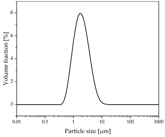 The starting powders were commercially available HA with a declared particle size of 2.5 ± 0.5 μm and purity of >95% delivered by KAMB Import-Export, Warsaw, Poland. Dry milling was used to improve the uniformity of the HA powder feedstock. Particle size distribution was carried out by a Mastersizer 3000 (Malvern PANalytical, Malvern Worcestershire, UK) analyzer using the laser diffraction technique. The particle size of the HA powder ranged from 0.1 to 4.5 μm (Figure 2).