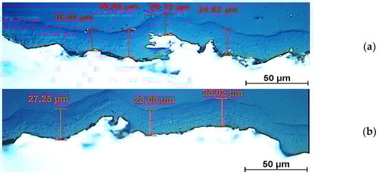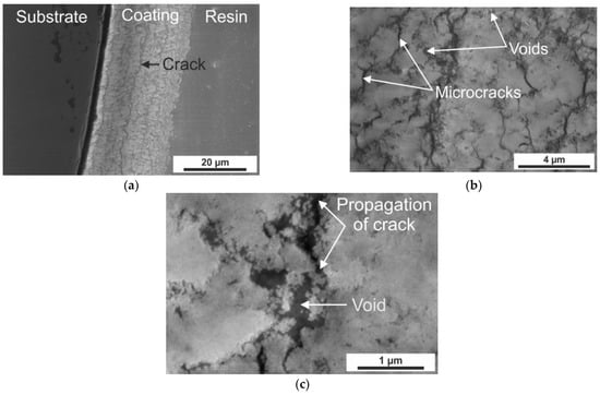 It is evident from the SEM images of cross-sections (Figure 4a–c) that the HA layers’ interface comprises micro-cracks and pores of different sizes. A possible reason for their origination may be internal stresses within the coating after the spraying process as well as low particle cohesion due to the deposition of agglomerated particles. Additionally, it can be seen from a coating–substrate examination that the coating exhibits a slight debonding from the substrate, which occurred during the mounting of the samples.