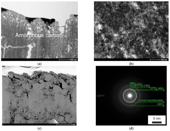 TEM examination of coating cross-section foils allows evaluating the structure formation features at high magnifications. The coating samples were covered by ≈100 nm amorphous carbon layer before observations (Figure 5a, arrows). The results (Figure 5) reveal the following coating specific features: