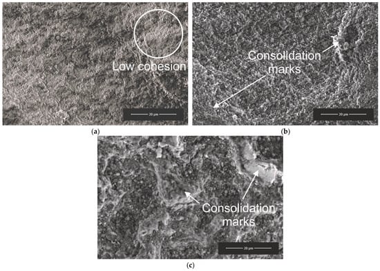 SEM micrographs of the HA coating surface topography are shown in Figure 6. The dispersed surface morphology after spraying is characterized by HA particle agglomerate formation with separate micropeaks and high porosity (Figure 6a). Pressureless Sintering changes the coating surface topography by bonding and shrinkage process development (Figure 6b). The coating topography after SPS sintering shows valleys of 10–15 µm (Figure 6c). The coatings exhibit 10–20 µm sized pits and protrusions on their surfaces, indicating non-uniform sintering and densification of the separate areas (shown by arrows). The roughness of these areas is smaller than that of neighboring ones. This needs to be taken into account because it is well known that surface roughness is critical in allowing cell growth because the surfaces influence protein interaction, which determines subsequent cell adhesion [30]. The SEM micrograph of the cross-section of as-sprayed HA coating (Figure 4b,c) reveals the presence of some cracks and pores, while SPS results in increased coating consolidation and possible microcracks’ healing (Figure 6c). Similar results were observed for as-sprayed and post-heat-treated HA-based coating in [31].
