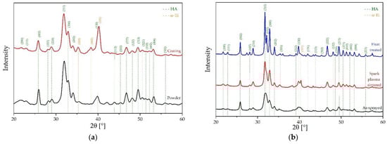 X-ray diffraction pattern of HA: (a) powder and coating as-sprayed, (b) coating in as-sprayed, heat-treated, spark-plasma-sintered state at 800 °C.