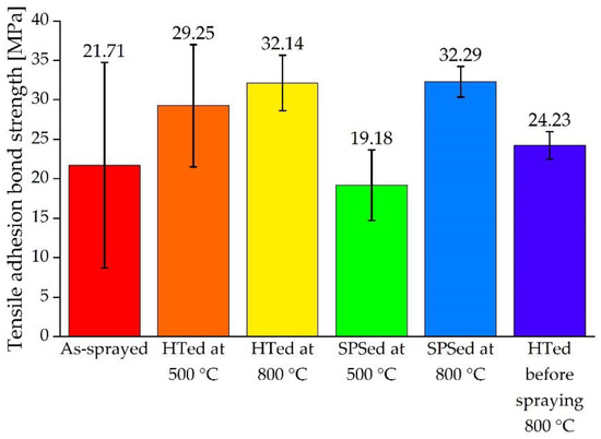 The results contrast with the results obtained as a result of the heat treatment of other thermally sprayed hydroxyapatite coatings [15,31]; however, cold sprayed (solid-state deposited) coatings tend to present an increase in adhesion strength after heat treatment (as shown in conducted experiments) due to intense diffusion. The SPS method has an additional advantage for the improvement in coatings adhesion—the heat is generated at the interface areas (particle–particle and substrate–coating areas), improving both cohesion and adhesion of the coatings in much shorter sintering time than HT [36].