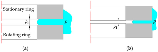For the sealing interface composed of rotating and stationary ring materials that cannot be wetted, the capillary force formed by the sealing medium in the microchannel prevents the leakage of the sealed medium [4]. To ensure that the sealed medium exists in the sealing interface to achieve lubrication, while not leaking from the microchannel, it is necessary to control the size of the microchannel pore. Increasing the face contact pressure can reduce the porosity of the sealing interface, reduce the radius of the void capillary, increase the capillary force, and improve the leakage resistance of the sealing interface [3], as shown in Figure 2. That is, it can be seen from Figure 2 that when the face contact pressure increases, the asperities of the sealing interface will be further deformed, and the microchannels between the sealing interfaces will change from large-diameter microchannels to small-diameter microchannels.