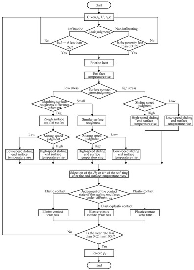 According to the obtained temperature rise of the sealing interface, the material hardness Hs of the soft ring at different temperatures can be determined. Next, use the face contact pressure pc to judge the contact state of the seal end face contact pair (the method for judging the contact state of the contact pair under different face contact pressure pc can be found in reference [16,21]) so as to select the corresponding deep wear rate calculation formula to calculate the size of the deep wear rate of the sealing interface.