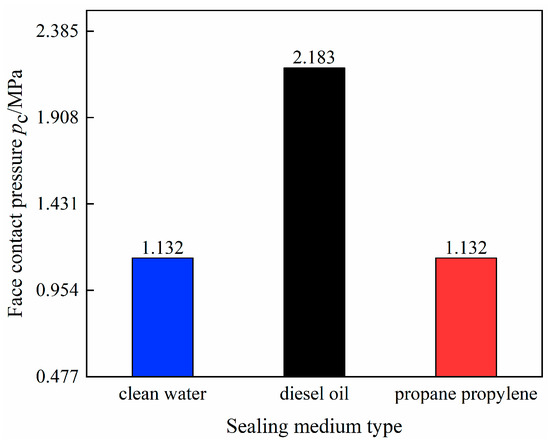 It can be seen from Figure 4 that the face contact pressure range of clean water and propane propylene is 0.477~1.132 MPa. The face contact pressure range of diesel oil is 0.477~2.183 MPa, which is greater than that of clean water and propane propylene. In other words, under this working condition, diesel oil can provide a more relaxed face contact pressure selection space to ensure the zero-leakage and long-life operation of the mechanical seal under the permissible wear rate. In addition, it can be seen that the lower limit pcmin of the face contact pressure range of clean water, diesel oil, and propane propylene is 0.477 MPa. Moreover, when the material of the rotating and stationary ring and the surface morphology parameters are determined, the minimum face contact pressure pcmin corresponding to the zero-leakage condition of the sealing interface is found, and it has nothing to do with the sealing medium.