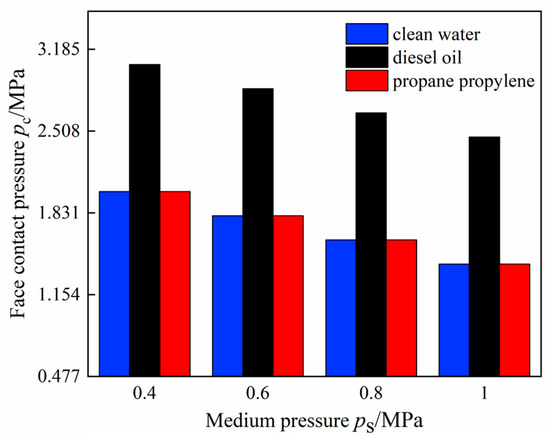 Figure 6 shows the variation of the face contact pressure range function of the pressure of the sealing medium while the other conditions are fixed. It can be seen that the increase in media pressure has the same influence on the face contact pressure range of the three-sealing media, which is embodied in the continuous reduction of the face contact pressure range when the medium pressure increases. By comparing Figure 5 and Figure 6, it can be deduced that the influence of the medium pressure on the face contact pressure range is lower than that of the operating speed.