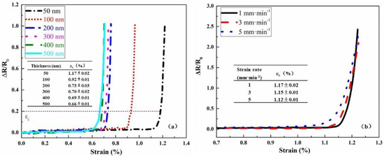(a) Fractional change in resistance (ΔR/R0) of ITO with different thicknesses deposited on PC as a function of strain ε; (b) ΔR/R0~ε curve of ITO with 500 nm thickness deposited on PC under different strain rates. R0 denoted the electrical resistance of the unloaded ITO thin film.