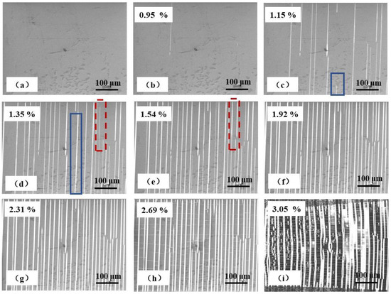 The typical process of crack initiation in stage I is illustrated in Figure 4a,b. There were no appreciable cracks before loading. As the tensile strain increased to a threshold value 0.95% (CIS was 0.95% for 50 nm thick ITO film), the first vertical crack occurred at random locations in the ITO film. The crack propagation process in stage Ⅱ is shown in Figure 4c–e. The number of vertical cracks along the tensile direction increased rapidly as the tensile strain increased, i.e., CD increased. A crack tip was found near the top edge of the blue solid rectangle box in Figure 4c at the tensile strain of 1.15% and this crack propagated upward and advanced outside of the same blue solid rectangle box at the tensile strain of 1.35% (Figure 4d). Meanwhile, cracks not existing at 1.15% strain in Figure 4c appeared in the red dash rectangular box at 1.35% strain in Figure 4d, and continued to grow upward at 1.54% strain (Figure 4e). The process of crack saturation and delamination in stage III is demonstrated in Figure 4f,g. As the strain increased further, the generation of vertical cracks diminished and crack saturation was reached; simultaneously, the lateral shrinkage of the film layer caused the generation of transverse cracks due to the Poisson’s ratio effects (Figure 4g). With further increasing strain, the increased transverse compressive stress drive resulted in the increase of the number of transverse cracks and the occurrence of buckling, followed by fracture and delamination (Figure 4h,i).