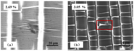 Buckling could be clearly seen, as shown in Figure 5. Buckling would cause the bending of the ITO fragments, resulting in tensile stress concentration at the apex of the bulge. Eventually the ITO film fractured parallel to the tensile direction and resulted in delamination (Figure 5b). With further lateral shrinkage, the crack fragments tended to overlap (red solid rectangular box in Figure 5b), which further contributed to the delamination.