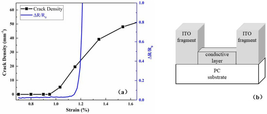 (a) The crack density and the variation of electrical resistance of ITO films with different thicknesses deposited on PC substrates as a function of the applied strain; (b) A model showing the conductive layer between ITO fragments.