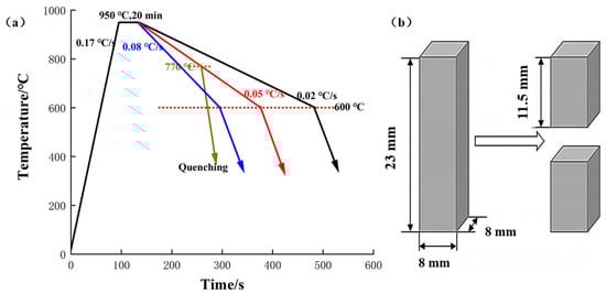 Samples processing. (a) schematic diagram of the precisely designed cooling rate heat treatment at a cooling rate of 0.08, 0.05, and 0.02 °C/s and quenching; (b) schematic diagram of sample cutting.