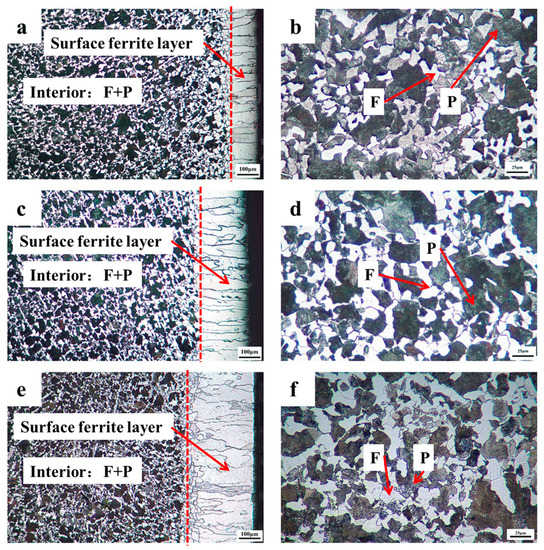 Figure 2 depicts the microstructure of the materials mentioned above using an optical microscope. Figure 2a,c,e represents the surface region with the transition from ferrite near the surface to a mixed phase of ferrite and pearlite in the interior at a cooling rate of 0.08, 0.05, and 0.02 °C/s; Figure 2b,d,f represents the mixed phase of ferrite and pearlite in the interior of the sample at a cooling rate of 0.08, 0.05, and 0.02 °C/s. It can be shown that after carefully designed cooling rate heat treatment at a cooling rate of 0.08, 0.05, and 0.02 °C/s, the multilayer structure with an evident interface in 0.45% carbon steel were all effectively manufactured. The surface of the samples in Figure 2 has a dazzling white single-phase ferrite structure with a thickness ranging from 150 to 340 µm, whereas the interior region comprises ferrite and pearlite structures, showing the creation of the multilayer structure. This finding is comparable to that of the surface ferrite layer of a low carbon steel (0.054%) reported by Zhang et al. [6,7].