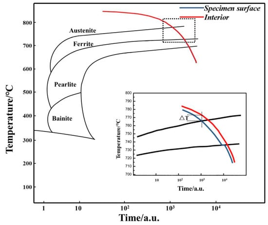 With the further temperature decrease, when the temperature of the sample is lower than Ar1, the internal austenite will transition to pearlite. As it is a single-phase ferrite on the sample surface, the area where the pearlite transition happens should be from the phase interface between the surface ferrite and austenite to the core of the sample. It is indicated by the deviation of the cooling curve of the sample surface at Ar1 in the expanded schematic image shown in Figure 3.