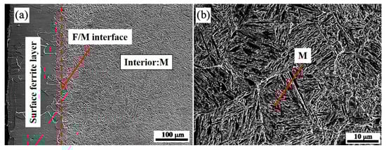 The cross-sectional SEM morphology of 0.45% carbon steel quenched at 770 °C: (a) surface; (b) interior.