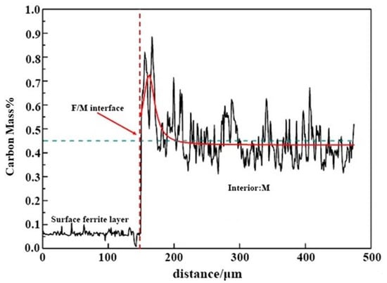 The carbon content distribution and related morphology of 0.45% carbon steel after quenching at 770 °C are determined using EPMA. As demonstrated in Figure 5, the carbon content of the surface is only 0.065%, suggesting the existence of a ferrite layer on the surface. Within a specific area, around 150 µm away from the surface, the distribution of carbon contents displays a “peak-shaped” fluctuating distribution; the peak of the carbon contents is located near the phase boundary between ferrite and austenite, which is up to about 0.8%. However, the carbon concentration is approximately 0.4% at a place far away from the interface. The carbon content distribution in the sample treated by decarburization heat treatment shows no peak, which is entirely different from this study. The reasons are provided as follows. During the carefully selected cooling rate heat treatment, the proeutectoid ferrite nucleates and develops on the surface. The ferrite layer on the sample surface pushes the carbon atoms to the phase interface during the ferrite development process. Then the carbon atoms constantly diffuse into the austenite. Thereby a gradient distribution of carbon contents at the front of the phase interface is generated, and a fluctuation distribution of carbon in the austenite is formed [17]. The peak in carbon contents is located on the austenite side at the phase interface. The EPMA data indicate the carbon content distribution in the surface ferrite layer of 0.45% carbon steel. They also display direct evidence of the long-range diffusion of carbon from ferrite to the austenite during the creation process of the surface ferrite phase.