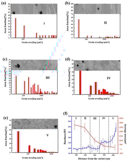 To further describe the microstructure, the surface ferrite layer was evenly split into five sub-regions (Figure 6c) along the growing direction of the columnar grains, which are marked out by I, II, III, IV, and V, in Figure 6a, respectively. It needs to be pointed out that the columnar grains’ length/diameter ratio differs. Thus, the grain size distribution mentioned in this study is determined by the grain area to limit the experimental error. Figure 7a–e illustrates the grain size distribution and the corresponding areas described above as I, II, III, IV, and V. The grain size is reduced from the outside to the inside. From the exterior to the interior of the surface ferrite, the average grain sizes of I–V are 2765.9, 2458.5, 999.6, 307.2, and 186.3 μm2, respectively.