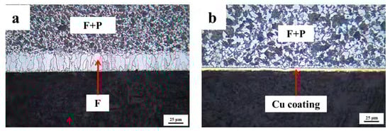 After the designed cooling rate heat treatment, the cross-sectional micrographs of 0.45% carbon steel with destroying Cu coating and without destroying Cu coating. (a) without destroying Cu coating; (b) with destroying Cu coating.