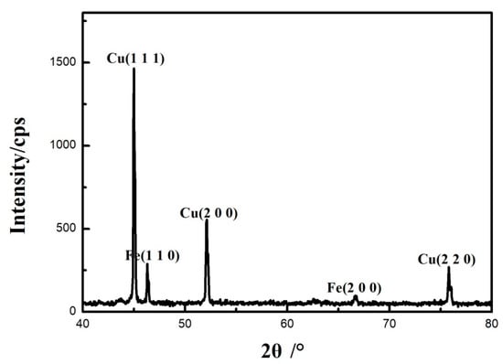 The surface of 0.45% carbon steel without damaging Cu coating after oxidation was examined by X-ray diffraction. The XRD examination in Figure 9 demonstrates that, following oxidation, a copper oxide-free structure on the surface is generated, consisting of only the copper phase, showing the efficiency of the Cu coating as a barrier inhibiting carbon transport and thus hindering the decarburization process.