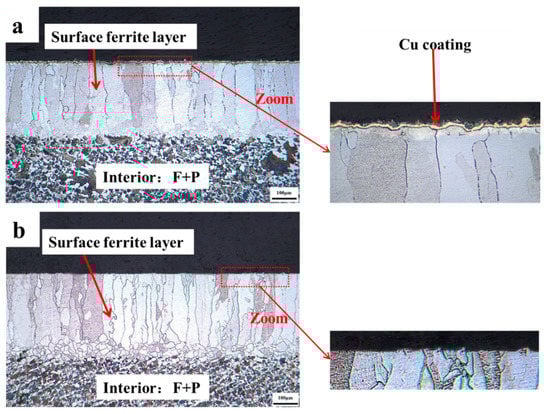 To identify that Cu coating as a barrier may successfully prevent decarburization, the quenched 0.45% carbon steel with destroying the Cu coating and without destroying the Cu coating are concurrently conducted oxidation processes. The cross-sectional micrographs of 0.45% carbon steel when destroying the Cu coating and without destroying the Cu coating after oxidation are presented in Figure 8. It reveals that a visible decarburization layer emerges on the surface of 0.45% carbon steel with a damaged Cu coating. However, there is no decarburization layer on the surface of the sample without degrading the Cu coating, while the Cu coating is thick and uniform, thereby promoting the unique performance of the Cu coating as a barrier impeding the diffusion of carbon atoms to the surface.