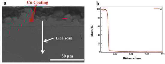 Figure 11 illustrates the line scanning element Cu distribution over the cross-section of 0.45% carbon steel following heat treatment at a controlled cooling rate that did not remove the Cu coating (Figure 11). It can be seen that, after heat treatment with a predetermined cooling rate, the Cu coating is continuously spread throughout the substrate, which is dense and free of oxidation. As a result, the unique performance of Cu coating as a barrier may be successfully achieved during the heat treatment at the specified cooling rate.