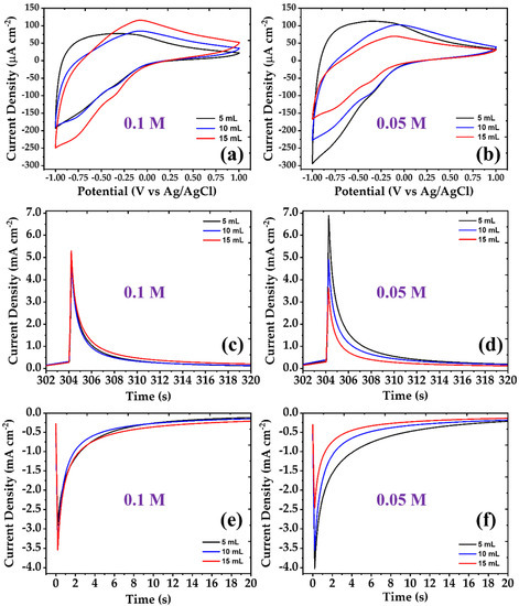 The electrochemical performance of the samples was studied in a three-electrode cell, by cycling the potential between −1 V and +1 V at a scan rate of 10 mV s−1, using 1 M LiClO4 in propylene carbonate as electrolyte (Figure 1a,b). As the concentration and the precursor volume changes, the shape of the respective curves also changes. In particular, in the samples made with the 0.1 M solution, as the precursor volume increases, the current density also increases, while, the opposite behavior was observed with the samples of the 0.05 Μ solution. Regarding the shape of the electrochemical curves, the lowest precursor volume samples (5 mL) in both series exhibit small peak values in the cathode, in contrast to the samples made with larger precursor volumes. The coatings in all series exhibit one large anodic peak and two smaller cathodic peaks, which are attributed to ions’ intercalation and deintercalation, respectively, accompanying the gain and the loss of an e−. In the case of films grown from the higher precursor concentration, the anodic peak occurs at −0.345 V (5 mL) and −0.096 V (10 and 15 mL), while for the films grown from the 0.05 M precursor concentration, at −0.37 V (5 mL), −0.086 V (10 mL) and −0.128 V (15 mL), respectively. On the other hand, the cathodic peaks for the films of the 0.1 M series are at approximately −0.732 and −0.322 V (5, 10, 15 mL) for all precursor volumes, while for the films grown from the 0.05 M precursor concentration, the cathodic peaks occur at: −0.733 and −0.298 V (5 mL), −0.762 and −0.361 V (10 mL) and −0.763 and −0.347 V (15 mL).