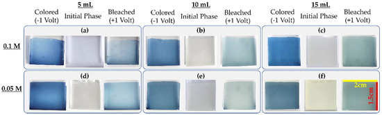 Color shades of the initial, bleached and colored state of the WO3 coatings with an active area of 2 cm × 1.5 cm: (a) 5 mL with 0.1 M; (b) 10 mL with 0.1 M; (c) 15 mL with 0.1 M; (d) 5 mL with 0.05 M; (e) 10 mL with 0.05 M; (f) 15 mL with 0.05 M.
