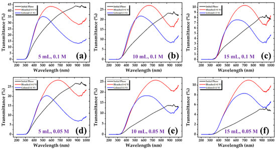 UV-Vis transmittance comparison of the initial, bleached and colored state of the 1st cycle of WO3 coatings: (a) 5 mL with 0.1 M; (b) 10 mL with 0.1 M; (c) 15 mL with 0.1 M; (d) 5 mL with 0.05 M; (e) 10 mL with 0.05 M; (f) 15 mL with 0.05 M.