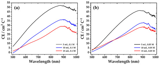 Coloration efficiency comparison as a function of the measured wavelengths: (a) 5, 10 and 15 mL with 0.1 M; (b) 5, 10 and 15 mL with 0.05 M.