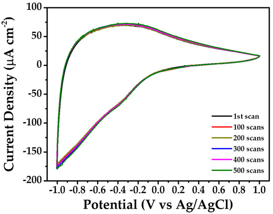 Multiple scans of cyclic voltammetry were performed for each sample in order to verify their stability, where the applied voltage was scanned between −1 V and +1 V and at a scanning rate of 10 mV sec−1. Figure 5 presents the results of this study, where one can see that the samples maintain their original cyclic voltammetry curve without any particular obvious modification in the current density or the shape of the curve, even after 500 scanning cycles. The differences in the curves are so small that they reach the limits of statistical error of the instrument, as can be seen in Figure 5, where one curve overlaps the other. Based on these, one can conclude that these WO3 films have very good stability over time.
