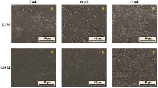Surface morphology of WO3 thin films studied in this work–FE-SEM images of WO3 coatings grown from precursors: (a) 5 mL with 0.1 M; (b) 10 mL with 0.1 M; (c) 15 mL with 0.1 M; (d) 5 mL with 0.05 M; (e) 10 mL with 0.05 M; (f) 15 mL with 0.05 M.