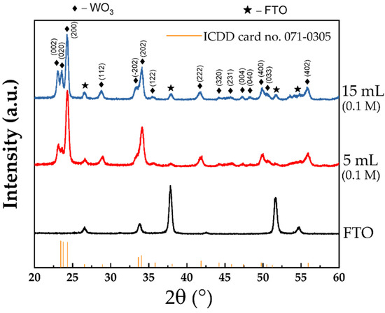 In order to study the crystallinity of the WO3 films, grazing incidence X-ray diffraction was employed. The incidence angle was kept at 0.5°, while the X-ray pattern was recorded in the 2θ range of 20–60°, as shown in Figure 7, for two WO3 films’ cases and the substrate.