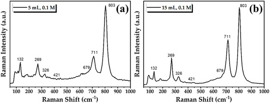 Typical Raman spectra of the developed WO3 films can be observed from Figure 8, where the peaks at 269 and 326 cm−1 correspond to the O–W–O bending modes of binding oxygen of WO3, while those between 600–1000 cm−1 to the W–O stretching modes. The strong peaks in each spectrum at 269 cm−1 δ (O-W-O stretching), and at 711 and 803 cm−1 (W-O-W anti-symmetric stretch) are due to monoclinic structure WO3 (δ -WO3 only modes). Peaks associated with the ε phase appear at 326, 421 and 679 wavenumbers. A band corresponding to the lattice vibration is present at 120 cm−1.