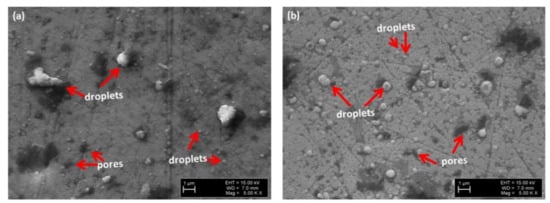 Figure 1 shows the surface morphology of as-deposited ta-C and Al2O3/ta-C coatings. The alumina layer grows conformally, resembling the morphology of the ta-C surface [,]. The roughness Ra of ta-C and Al2O3/ta-C was 0.08 and 0.09 μm, respectively. The droplets and pores are visible on the surface of both coatings.