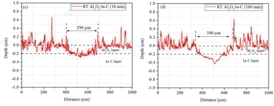 Depth profiles of wear scars observed on the ta-C and Al2O3/ta-C coatings after the sliding tests for (a,c) 10 min and (b,d) 180 min at RT.