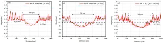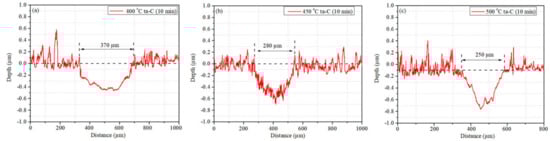 The depth profiles of wear scars observed on both types of coatings after the sliding tests at HT (400–500 °C) are shown in Figure 4. The shorter (10 min) tests were carried out to investigate the tribological properties of coatings prior to coating failure. In the case of ta-C coating, the depth of wear scars increases quickly with the temperature increasing (Figure 3a and Figure 4a–c). In the case of Al2O3/ta-C, an increase in depth and width can be seen as well (Figure 3c and Figure 4d–f), and the width after the tests at highest temperatures (450 and 500 °C) is about twice larger than with the ta-C coating (Figure 4b,c,e,f). The depth of the wear scars (within ta-C layer) after 10 min friction tests at RT, 400, 450 and 500 °C is about 0.18, 0.45, 0.7 and 0.75 µm for ta-C and 0.1, 0.15, 0.3 and 0.3 µm for Al2O3/ta-C coating. Thus, the different shapes of the wear scars reflect a dissimilarity of wear mechanisms of ta-C layer for the ta-C and Al2O3/ta-C coatings, and a longer operational lifetime can be expected for Al2O3/ta-C in contrast to the ta-C coating under HT conditions in air. In other words, the adaptation effect and chemical conditions within the wear scar can influence the tribological behavior.