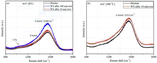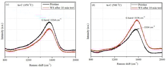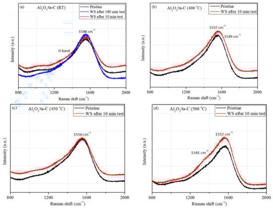 Raman spectroscopy is a standard technique to reveal the nature of carbon–carbon bonding [,,]. Raman measurements were repeated for at least three different locations within the wear scar. The results obtained on the pristine and wear scar surfaces of the ta-C and Al2O3/ta-C coatings are shown in Figure 7 and Figure 8. The D and G band peaks position and intensity and full width at half maximum of the G peak (FWHM(G)) were obtained using Gaussian functions fitting of Raman spectra. The G peak is assigned to the stretching of sp2 bonds on both ring and chains, whereas the D peak is assigned to the breathing mode of sp2 bonds in rings []. The t-Pa peak at 1054 cm−1 corresponds to the vibrational modes in trans-polyacetylene []. The relative content of sp2 to sp3 bonds is related to the D and G peaks intensity ratio []. The Raman G peak (1548–1557 cm−1) was observed in spectra taken on the pristine and wear scar surfaces of both coatings (Figure 7 and Figure 8). The G band peak shifts to higher value (1576 cm−1) after the sliding tests at 500 °C for the ta-C coating (Figure 7d), which indicates changes in the structure of the sp2 bonds. On the other hand, the Al2O3/ta-C coatings shows no significant G peak shift within the wear scar after HT sliding tests (Figure 8b–d). Similar behavior of the G peak was observed in our previous study on the a-C:H:Si and Al2O3/a-C:H:Si coatings [].