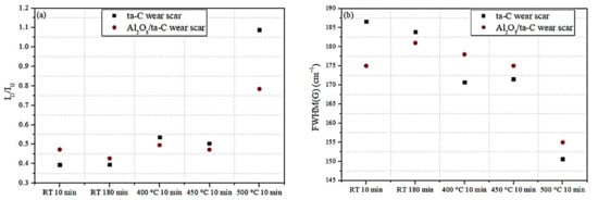The ID/IG ratio and FWHM(G) extracted from Raman spectra taken within the wear scars are shown in Figure 9. The smaller value of the ID/IG ratio corresponds to the higher sp3 bonds fraction and therefore higher coating hardness. It is expected that the Al2O3/ta-C coating possesses better mechanical properties at HT as compared with the ta-C coating due to higher sp3 bonds fraction (Figure 9a). The FWHM(G) value for DLC is sensitive to the stress-related disorder in the sp2 carbon clusters []. Casiraghi et al. [] suggest that FWHM(G) quantifies the bond length and angle disorder in sp2 clusters. The size of sp2 clusters within the sp3 network decreases as the sp3 content increases, thus sp2 clusters become more strained. For instance, FWHM(G) increases with the increase of the sp3 bonds content in the H-free DLC [,,]. The larger width of the G peak observed for Al2O3/ta-C after the sliding tests at HT indicates smaller sp2 fraction and higher stress within the sp2 clusters in Al2O3/ta-C as compared with the ta-C coating (Figure 9b). The abovementioned shift of the Raman G peak to higher value in the tests at 500 °C observed on the ta-C coating is in a good agreement with this conclusion, i.e., it indicates structural changes within the sp2 carbon clusters as well. The analysis of both the ID/IG ratio and FWHM(G) suggests that the content of sp3 bonds is higher for the Al2O3/ta-C coating in contrast to the ta-C one after the sliding tests at HT. Therefore, enhanced tribological properties (higher hardness and thermal stability) of the Al2O3/ta-C coating at HT can be related with the higher content of the sp3 bonds in the wear scar area as compared with the ta-C coating. A similar conclusion was reached in the case of Al2O3/a-C:H:Si [] and DLC doped with oxygen [,] tested at HT in air. In addition, the duration of extended tests was 180 min, i.e., the entire surface of the ta-C coating was exposed to air at HT during the sliding tests. Therefore, the ta-C coating surface was oxidized and the crystal structure of the top and deeper layers of the ta-C coating was changed, leading to the fast increase of the wear scar depth observed in HT tests (Figure 4a–c). It was shown in our study on the Al2O3/NCD coating [] that the alumina layer is the atmospheric oxygen diffusion barrier layer as well.