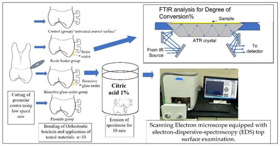 The enamel surfaces’ protection percentage for all groups was compared using the Wilcoxon signed-rank test [28] before and after exposure to the erosive challenge. Finding no signs of erosion of the enamel surrounding the orthodontic brackets (after the erosive challenge) was considered to show 100% protection of the enamel. The Kruskal–Wallis test was utilized to compare the degree of protection among the groups. Statistically significant differences between the groups were detected at the level of 0.05. The degree of conversion readings for the experimental resins were obtained. SPSS (v24, IBM, Armonk, NY, USA) was employed to conduct the statistical analysis process.