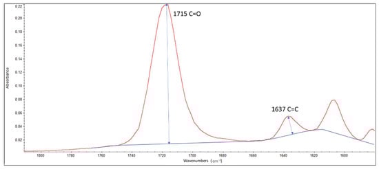 FTIR/ATR (Figure 1) was used to detect the degree of conversion of the experimental resin sealers. An FT-IR spectrometer (Nicolet iS5 FT-IR, Thermo Electron Scientific Instruments LLC, Madison, WI, USA), equipped with an ATR attachment with multiple reflections, was employed to detect the spectra of the resins before and after light cure polymerization. The light curing unit was installed at a constant distance from the sample. A drop of each resin system (n = 5) was dispensed onto the diamond crystal, followed by light curing for 30 s by a calibrated light-emitting diode (LITEX 695, 1200 mW/cm2, Den-tamerica, San Jose Ave, CA, USA). All FTIR spectra were detected under standardized conditions [25]. The uncured resin in each group served as the control for the cured resin. The peak height was measured from the top of the peak to the baseline, utilizing a specific software installed by the FTIR spectrophotometer manufacturer. The degree of conversion (DC%) was recorded after applying the resin systems, both with and without the bioactive glass, polymerized and unpolymerized directly on the FTIR/ATR crystal. The ratio of the absorbance peak of the aliphatic carbon–carbon double bond was determined by measuring the 1637 cm−1 peak height and comparing it with the measurement of the 1720 cm−1 peak height (Figure 2).
