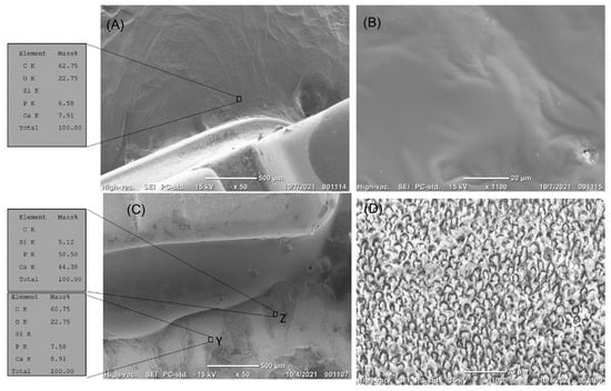 (A–D) The top surface of the enamel treated by bioactive glass resin sealer next to the orthodontic brackets before erosion. (A) The enamel surface is covered with the bioactive glass resin sealer. EDS analysis showed a high content of carbon, with the calcium and phosphate content hardly detected. (B) High magnification of the treated enamel surface showed complete coverage of the enamel surface by the bioactive resin, with evidence of the dispersion of the bioactive particles in the resin matrix. (C,D) The top surface of the enamel treated by bioactive glass resin sealer next to the orthodontic brackets after erosion. (C) The bioactive glass resin sealer resisted erosion. EDS analysis showed a high content of silica in areas of the bioactive glass dispersion (area Z), while areas of the resin matrix had carbon peaks clearly detected (area Y), with the calcium and phosphate content hardly detected. (D) High magnification of area Z showed silica-filler top surface.