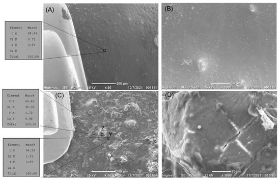 (A,B) The top surface of the enamel treated by Opal Seal sealer next to the orthodontic brackets before erosion. (A) The enamel surface is covered with the Opal Seal. EDS analysis showed a high content of carbon, with the calcium and phosphorus content hardly detected. (B) High magnification of the treated enamel surface showed complete coverage of the enamel surface by the Opal Seal resin, with evidence of the dispersion of the filler particles in the resin matrix. (C,D) The top surface of enamel treated by Opal Seal next to the orthodontic brackets after erosion. (C) The sealer resisted erosion. EDS analysis showed a high content of carbon, with nearly the same content of silica. (D) High magnification showed that the filler content was more clearly observed.