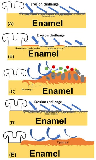 (A–D) Suggested mechanisms for the tested groups. (A) Untreated enamel surface exposed to erosion challenge suffered from erosion of the enamel surface. (B) Resin sealer devoid of bioactive particles was dislodged from 50% of the total surface area, exposing areas of enamel that were eroded. (C) When the salivary pH drops, due to the consumption of erosive drinks, the bioactive sealer will have parts of its resin matrix eroded by the erosive solution, exposing parts of the bioactive fillers that had silica forming on the surface. The silica-rich layer will have calcium and phosphate compounds forming on top of it (as was described by the theory introduced by Professor Larry Hench). The calcium and phosphate ions will be released into the low pH saliva, causing a decrease in its dental erosion potential. (D) Fluoride-treated enamel surfaces showed erosion of the enamel surfaces after the erosive challenge. (E) The enamel surfaces treated with Opal Seal showed protection of the enamel surface after erosion.