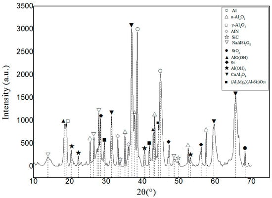 The AlN contents in different aluminum dross varied distinctly. To validate the accuracy of subsequent tests, predicting the AlN content in hydrolyzed products was necessary. Figure 2 depicts the XRD spectra of aluminum dross. Clearly, the hydrolyzed products contained Al, Al2O3, AlN, and other crystalline substances (amorphous components were excluded from the test results). The semi-quantitative XRD results of aluminum dross are detailed in Table 2. Since the aluminum dross used herein was already processed by ash frying, the AlN content was low, while the contents of Al2O3 and AlN were about 20% and 10%, respectively. Figure 3 displays the local EDS spectra at two material sites. Since almost all nitrogen contained in the aluminum dross was AlN, after conversion, the AlN contents in Figure 3a,b were estimated to be 12.97% and 16.37%, respectively.