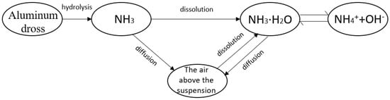 On the one hand, the NH3 produced during the hydrolysis of AlN in aluminum dross was dissolved in suspension as a soluble gas, and then hydrated to form NH3·H2O. On the other hand, part of the undissolved NH3 diffused above the suspension. Moreover, like other gas–liquid two-phase processes, the gas and liquid phases were dynamically interacting rather than mutually isolated. In macroscopic terms, the NH3·H2O in suspension was decomposed by heat, so that the ammonia gas was diffused above the suspension. Meanwhile, the ammonia gas in the air above the suspension was also continuously dissolved into the suspension. In the meantime, the formed NH3·H2O ionized into NH4+ and OH−, which also continued to reversely combine to form NH3·H2O [,]. The above reactions interacted to establish a stable dynamic equilibrium system. By measuring the pH of the suspension in the equilibrium state, and referring to the “direct characterization” procedure for measuring the AlN content in aluminum dross, we assessed the feasibility of the “indirect characterization” procedure for determining the hydrolysis rate of aluminum dross.